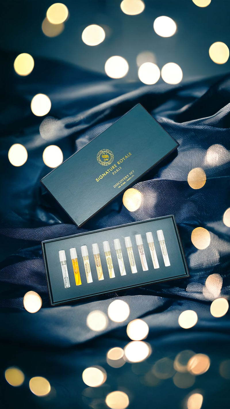 Plongez dans l’univers de Signature Royale avec notre Discovery Set de 10 fragrances emblématiques.